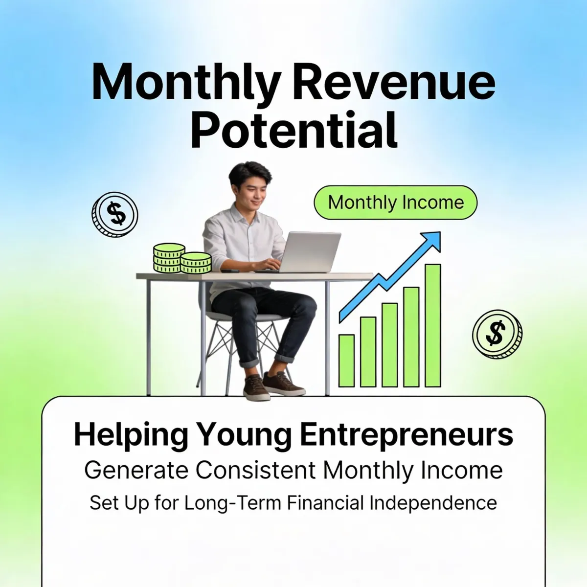 Our program is designed to help young entrepreneurs generate consistent monthly income, setting them up for long-term financial independence.