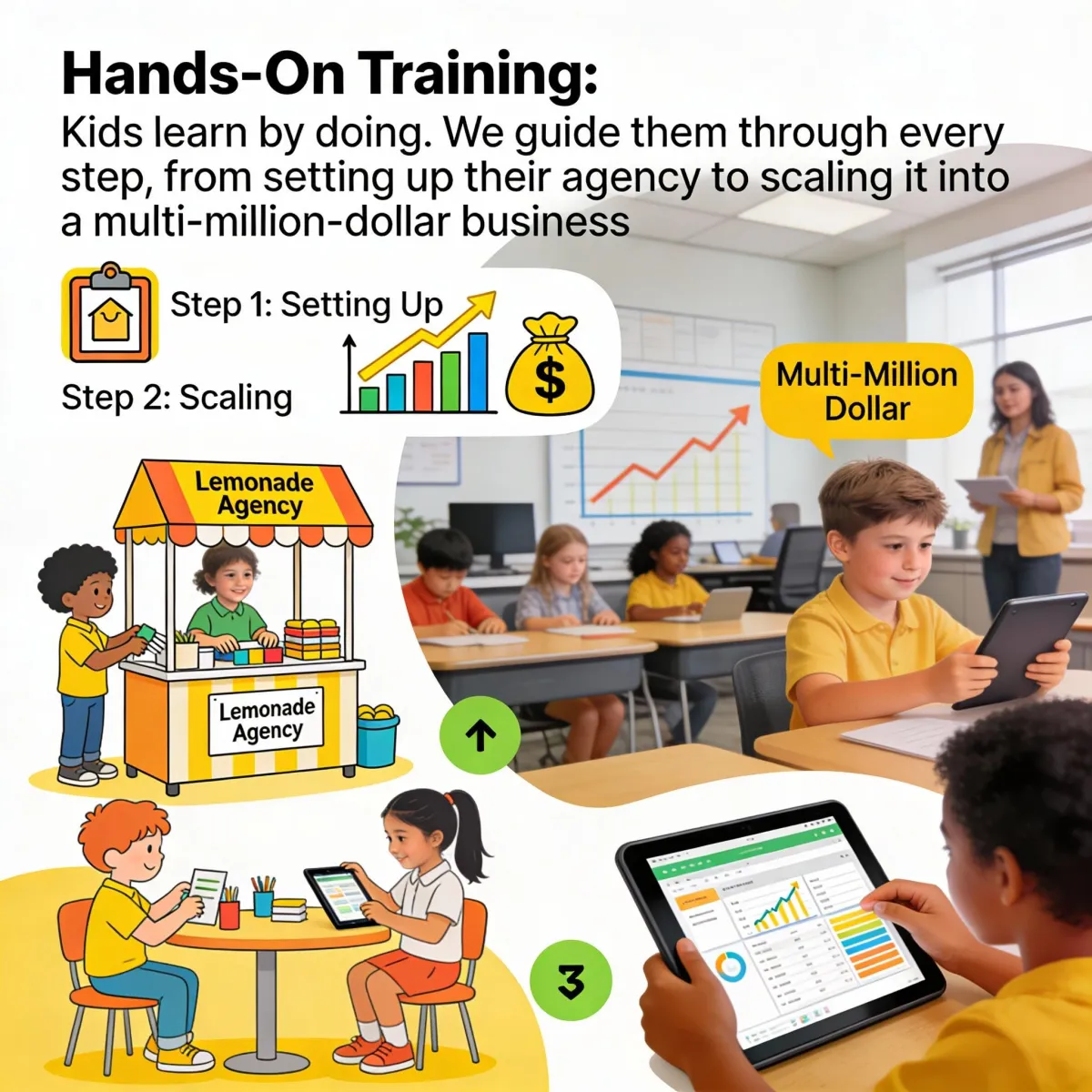 Kids learn by doing. We guide them through every step, from setting up their agency to scaling it into a multi-million-dollar business.