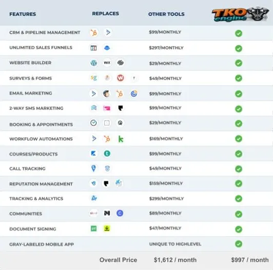 The TKO Engine Platform is everything that marketers need to manage their leads, websites, funnels, calendars and many other services that are needed to maintain a customer.